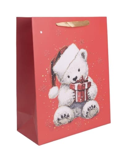 Közepes méretű ajándéktasak aranyos maci és ajándékdoboz motívummal, ideális kisebb könyvekhez, kozmetikumokhoz vagy karácsonyi meglepetésekhez.