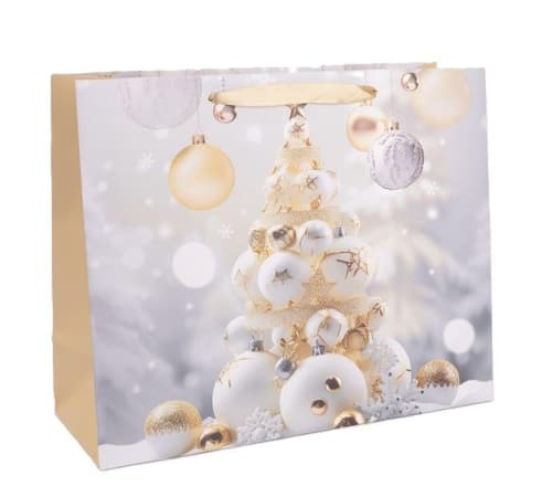Közepes méretű, elegáns fehér alapú ajándéktasak arany fenyőfa és karácsonyi gömbök mintával. Tökéletes választás kisebb ajándékok, édességek vagy kozmetikumok ünnepi csomagolásához.