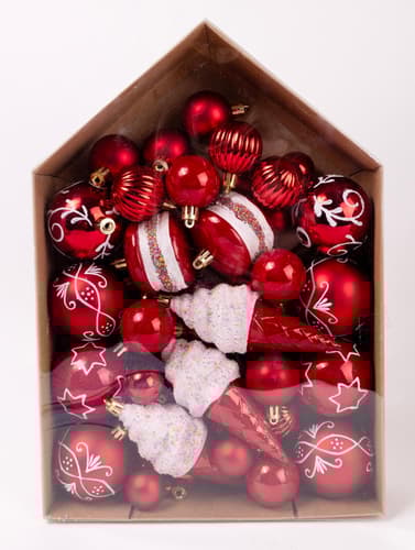 Teljes készlet piros és fehér karácsonyi díszekből, 52 darabos csomagban. Tökéletes választás a karácsonyfa gazdag, ünnepi díszítéséhez.