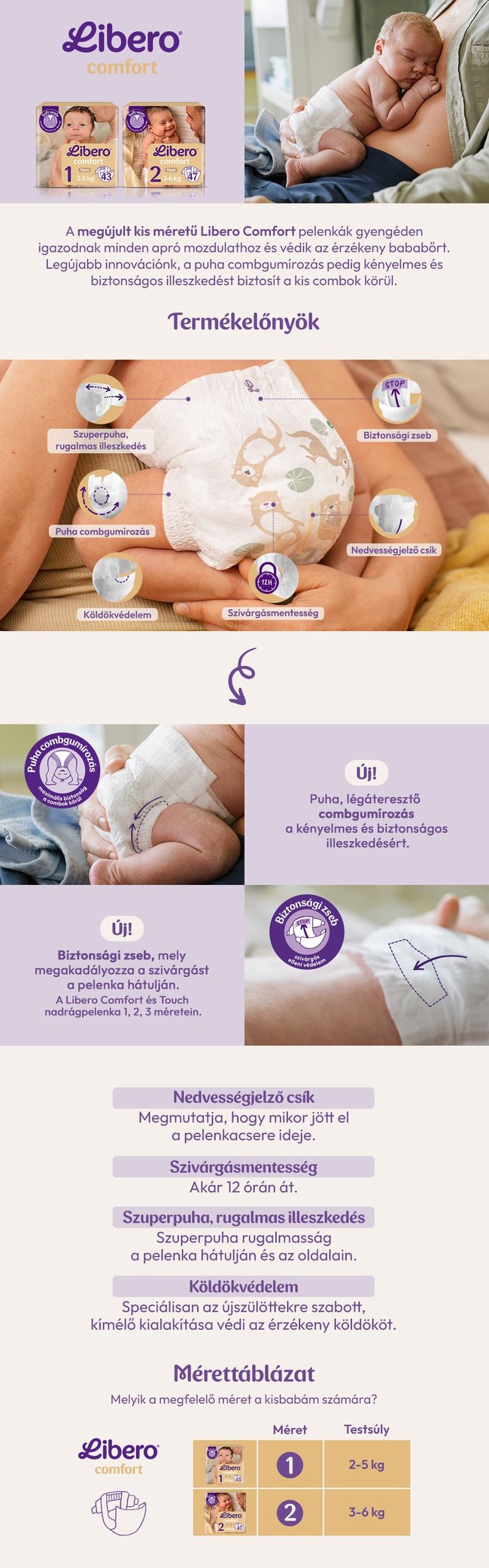 A Libero pelenkák bőrbarát, légáteresztő és bőrgyógyászatilag tesztelt anyagai védik a baba érzékeny bőrét. A nedvességjelző csík segít, hogy mindig tudd, mikor szükséges a csere, a puha kialakítás pedig óvja a köldök környékét.
