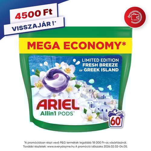Hozd el a friss, tengerparti fuvallatot a ruháid közé! Az Ariel All-in-1 PODS Fresh Breeze of Greek Island mosókapszula a Lenor inspirálta jázmin és tengeri só illattal nemcsak elképesztő frissességet, hanem ragyogó tisztaságot is biztosít – akár hideg vízben is.