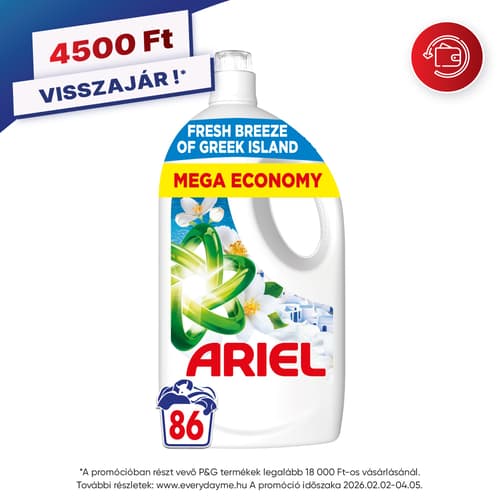 🧴 Ariel Folyékony Mosószer – Fresh Breeze of Greek Island (3,87 l – 86 mosás)