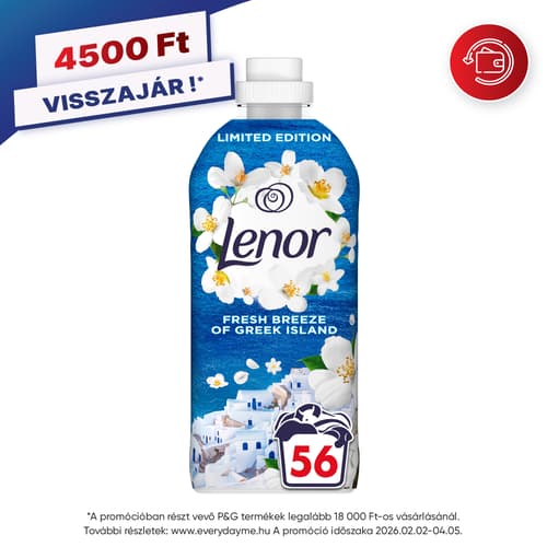 Élvezd a természet ihlette, hosszan tartó frissességet a Lenor Fresh Breeze of Greek Island öblítővel, és varázsolj tiszta, puhán illatozó ruhákat minden mosás után!