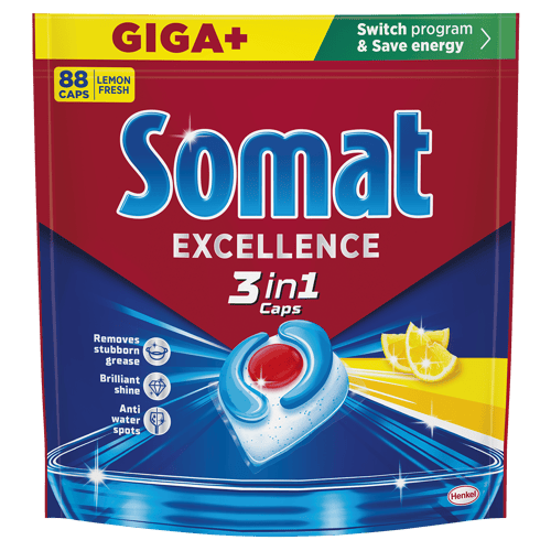 Fedezd fel a Somat 3in1 Excellence Lemon kapszula erejét, amely kompromisszummentes tisztaságot és ragyogást nyújt minden mosogatás során – még a legmakacsabb, rászáradt szennyeződésekkel szemben is.