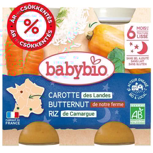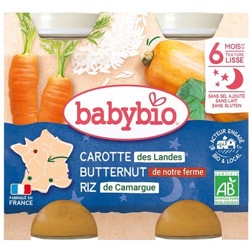 A Landes-i sárgarépa a homokos strandok közelében, a tengeri levegőn terem, ami finom, enyhén édes ízt ad neki, amit a babák imádni fognak! A BabyBio a Provence-i sütőtököt, Camargue-i rizst és helyben termesztett hagymát hozta össze, hogy megalkossa ezt az ízletes kis ételt.