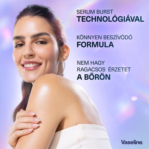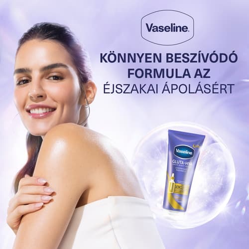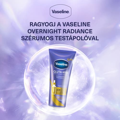 A Vaseline Overnight Radiance szérumos testápoló GlutaGlow technológiával, hialuronsavval és kollagénnel támogatja a bőr éjszakai regenerációját. Könnyed, gyorsan beszívódó formulája feltöltődött, üde bőrérzetet hagy maga után.