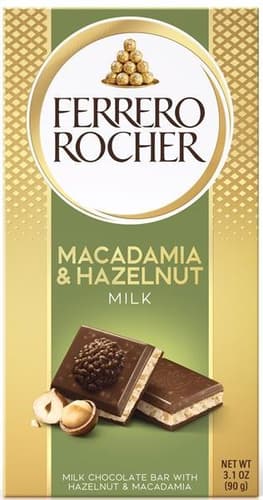 Tejcsokoládé (60%) mogyorós- és makadámia töltelékkel (37%) és mogyoródarabkákkal.