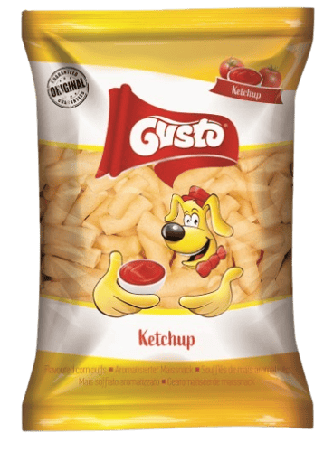 A Gusto ketchupos kukoricapehely a márka egyik ízesített, extrudált snackje, amely a ketchup jellegzetes, édes-savanyú ízével teszi különlegessé a ropogós kukoricapehelyt. Ez a változat a klasszikus Gusto pufik könnyedségét ötvözi a paradicsomos ízvilág kedvelőinek igényeivel.