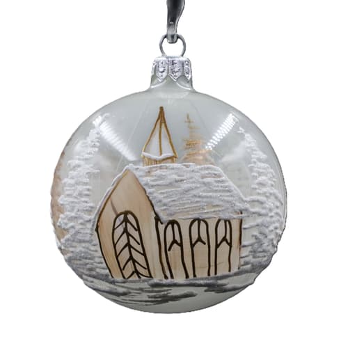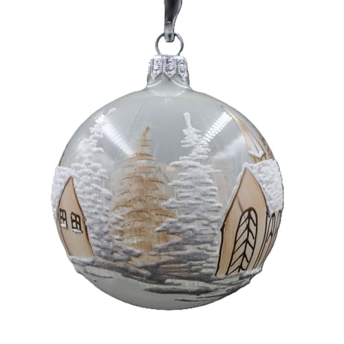 Kézzel fújt, exkluzív üveggömb, amelynek gyöngyház fényű felületét részletgazdag körbefutó tájkép díszíti. Elegáns, művészi kidolgozása különleges hangulatot kölcsönöz a karácsonyfának, miközben a gyöngyház fény játékosan tükrözi vissza az ünnepi világítást.