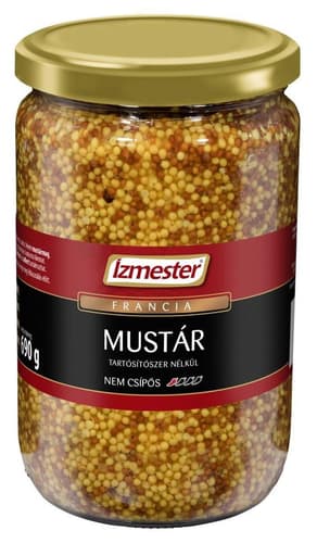 Kellemesen frissítő, savanykás, roppanós fekete és fehér mustármagokat tartalmazó mustár. A színes mustármagok és az ecet kombinációjának köszönhetően jól illik meleg és hideg húsételekhez, hidegtálakhoz, sajtokhoz, tojásokhoz, salátákhoz. Dekorációként is remekül használható a tányéron. Az Ízmester francia mustár nem tartalmaz tartósítószert vagy mesterséges adalékanyagokat.