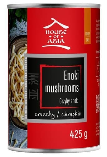 Enoki mushrooms in brine. Sterilized product. A unique type of mushroom, extremely popular in Asian cuisine. They are crispy and delicious.