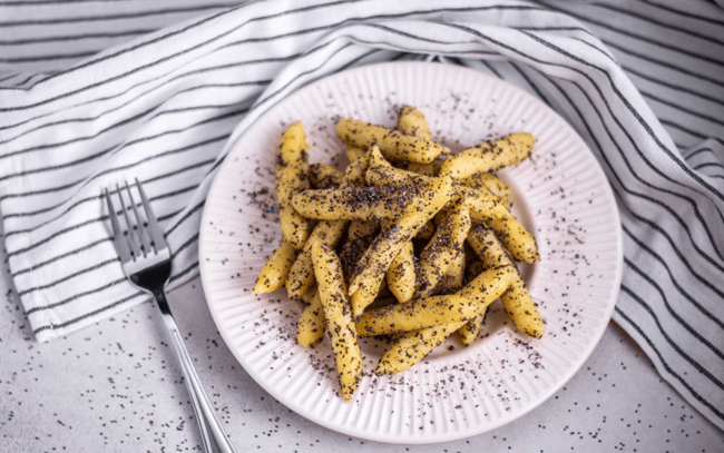 Puha burgonyagombócok, mákkal és cukorral meghintve – igazi csemege, amit gyerekek és felnőttek egyaránt imádnak.