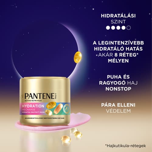Fedezd fel a Pantene Hydration Recharge Keratin Protect hajpakolást, a legintenzívebben hidratáló hajápoló termékünket rendkívül száraz hajra. A mikro-tápanyagokkal dúsított PRO-V és az ACTIVE NUTRI-PLEX technológiával készült formula akár 8 réteg mélyen táplálja a hajad, és óvja azt a párával szemben.