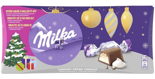 Milk chocolate Christmas candy made with Alpine milk, with yoghurt-flavored cream filling (35%) and crispy rice flake pieces (1.5%).