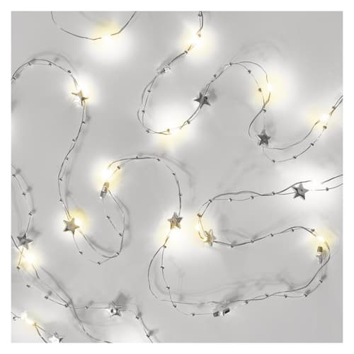 Create a festive atmosphere in your home with this 1.9-meter long LED light chain, decorated with silver stars. The warm white LED lights provide soft, cozy illumination, making it a perfect choice for shelves, windowsills, Christmas trees, or as a table decoration. The cable is transparent, so the lights appear elegantly, and the stars seem to float in the air.