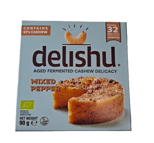 A Delishu fermentált, kesudió alapú érlelt sajt jellegű készítmény színes borssal a növényi gasztronómia igazi mesterműve, amely a kézműves sajtok komplex ízvilágát idézi meg teljesen növényi alapokon. A válogatott, fermentált kesudió természetesen krémes állaga és diós karaktere a hosszas érlelés során mély, gazdag aromákkal egészül ki, így egy prémium minőségű, karakteres ízű alternatíva születik a hagyományos sajtok helyett.