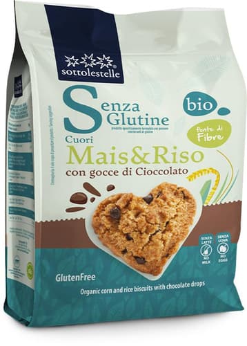A Sottolestelle BIO Kukorica- és rizskeksz csokoládédarabokkal egy könnyed, ropogós keksz, amely a természetes gabonák és a minőségi csokoládé harmonikus kombinációját kínálja. A kukorica és rizs alapú tészta természetesen gluténmentes és könnyen emészthető, a hozzáadott csokoládédarabok pedig gazdag, édes élményt nyújtanak minden falatban.