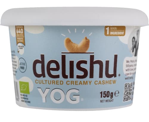 A Delishu Kesudió alapú joghurt jellegű készítmény egy növényi alapú, krémes állagú alternatíva a hagyományos tejjoghurtokhoz. Kesudióból készült, ezért természetes módon gazdag egészséges zsírokban, fehérjében és enyhén édeskés, diós ízvilágú. A fermentálási folyamat során kialakuló lágy, joghurtszerű állag és enyhén savanykás aromák egyensúlyt teremtenek, így minden kanál kényeztető élményt nyújt.
