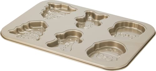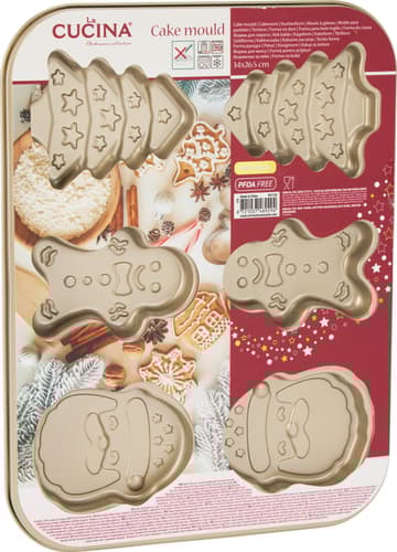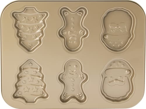 Ez a prémium minőségű, tapadásmentes bevonattal ellátott acél sütőforma megkönnyíti a sütést és kiemeli a karácsonyi hangulatot. A pezsgőarany színű forma 6 különböző ünnepi mintával – Mikulás, karácsonyfa és mézeskalács figura – varázsolja ünnepivé a süteményeidet.
