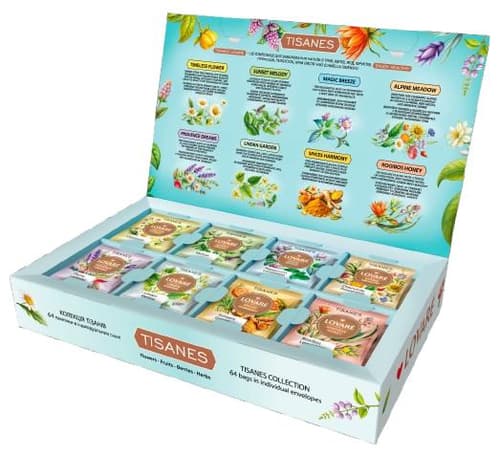 TIMELESS FLOWER (apróra vágott kamilla virágok 100%), SUNSET MELODY (apróra vágott citromfű levelek 100%), MAGIC BREEZE (apróra vágott borsmenta levelek 70%, apróra vágott citrommenta levelek 30%), ALPINE MEADOW (citromfű 30 %, kamilla virágok 28 %, zúzott alma 20 %, zúzott csipkebogyó 10 %, borsmenta levelek 6,5 %, narancshéj 5 %, sáfrány és búzavirág szirmok 0,5 %), PROVENCE DREAMS (csipkebogyó darabok 31,9 %, citromfű 20%, zúzott citromfűlevél 15%, kakukkfű 10%, zúzott kamillavirág 10%, levendula 8%, narancshéj 5%, citromverbéna 0,1%), LINDEN GARDEN (apróra vágott hársvirág 32%, almadarabok 20%, apróra vágott citromfűlevél 15%, citromfű 15%, csipkebogyó darabok 12%, apróra vágott borsmentalevél 5%, apróra vágott szederlevél 1%), SPICES HARMONY (citromfű 39%, rooibos 20%, zúzott gyömbér 20%, csipkebogyó darabok 7%, kurkuma 6%, narancshéj 5%, zúzott homoktövis levelek 1%, természetes kaki gyümölcs és mandarin aroma), ROOIBOS HONEY (rooibos 47%, citromfű 18%, zúzott kamilla virágok 10%, zúzott borsmenta levelek 10%, levendula 8%, zúzott citromfű levelek 5%, stevia levelek 2%).