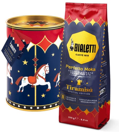 This gourmet Bialetti coffee, inspired by the traditional Italian dessert, boasts a rich aroma with notes of mascarpone, cocoa, and coffee. It's a subtly full-bodied and medium-roasted blend, ideal for those who love intense and delicate flavours. Now available in a unique tin can, which could be a perfect Christmas gift. Blend: 80% Arabica 20% Robusta. Ideal for use in moka pots.