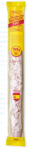 A Dacello Fuet 100 g késztermékhez 155 g húst tartalmaz, így garantáltan egyedülálló, igazi gourmet élményt nyújt