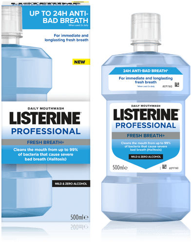 A Listerine Professional Fresh Breath+ szájvíz hatékonyan segít a rossz lehelet elleni küzdelemben. Illóolajokkal, cinkkel és szájüregi szagsemlegesítő technológiával akár 24 órás védelmet nyújt napi kétszeri használat mellett.