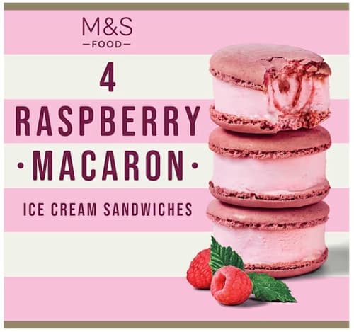 Almond and raspberry macarons filled with raspberry ice cream swirled with raspberry ripple.