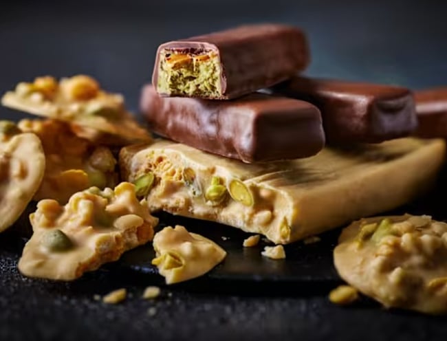 A karamellbe apróra vágott pörkölt pisztáciák keverednek, amelyek enyhén vajas, diós jegyet és gyönyörű textúrát adnak az élményhez. Természetes eleganciájukkal a pisztáciák kiegészítik a karamellt és a csokoládét is, mélységet és kifinomultságot kölcsönözve az egész szeletnek.