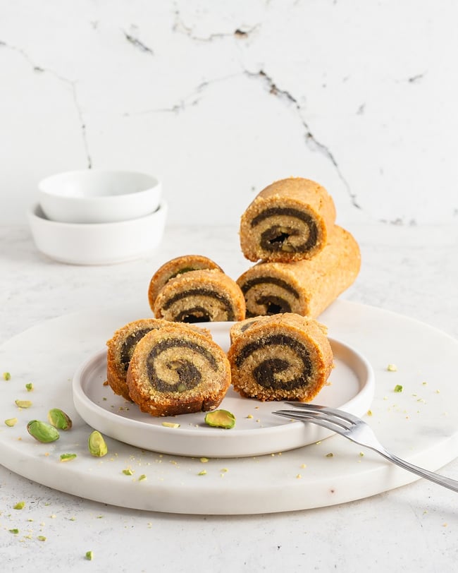 Ez a pisztáciás tekercs a természetes édesség és a krémes, diós luxus találkozása – egyszerre letisztult, modern és ellenállhatatlanul ínycsiklandó.