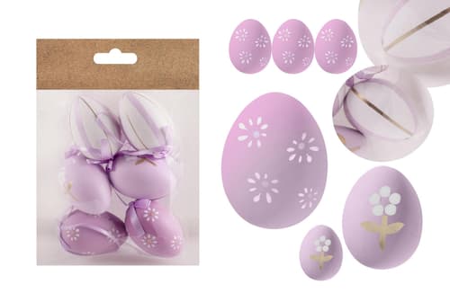 Kubo Húsvéti műanyag tojás akasztós lila, virág és csík mintával 4x6 cm, 6 db