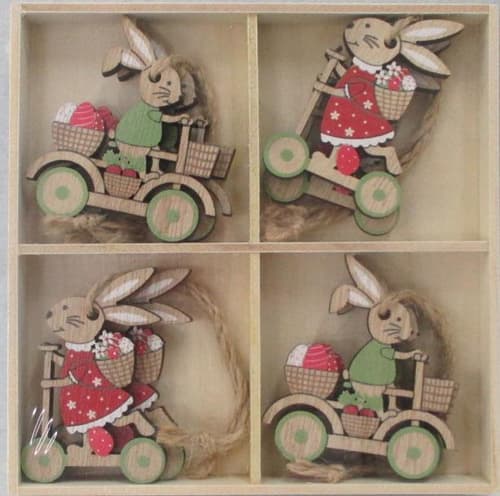 Dobd fel a húsvéti dekorációt ezekkel a vidám fa nyuszi figurákkal, akik épp rollereznek! Kis méretük és akasztós kialakításuk miatt tökéletesek tojásfára, ajtóra vagy kosárdísznek, és garantáltan mosolyt csalnak mindenki arcára.