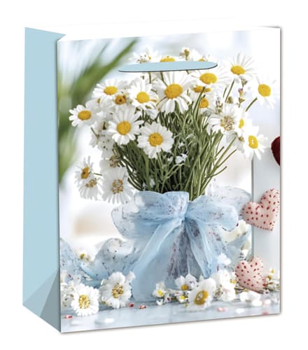 Tavaszi hangulat egy tasakban! A margaréta csokor motívum vidám és friss hangulatot hoz minden ajándékhoz.