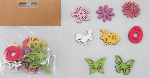 Apró, színes fa dekorációk, amelyek feldobják a húsvéti vagy tavaszi hangulatot.