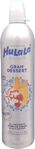 A HuLaLá Gran Dessert habspray egy cukrozott, UHT technológiával hőkezelt aeroszolos tejszínhab, amely ideális desszertek, italok vagy gyümölcsök díszítésére és ízesítésére.