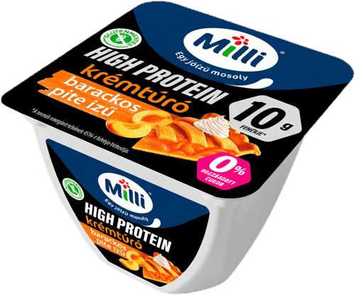 Milli Protein Barackos Pite ízű túrókrém – egy desszert jellegű, fehérjében gazdag, zsírszegény túrókrém, amely természetes sárgabarack aromával idézi meg a klasszikus barackos pite ízét. Ez a 150 g-os poharas termék gluténmentes, 0 % hozzáadott cukrot tartalmaz, így tudatosabb étrendbe is könnyen illeszthető, miközben az édes ízt édesítőszerek adják hozzáadott cukor nélkül. A sovány túró adja a krémes alapot (kb. 66 %), amely magas fehérjetartalmával hozzájárul a napi fehérjebevitel támogatásához és segít a laktató érzés kialakításában.