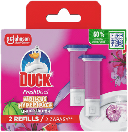 Frissítsd a WC-t a Duck Fresh Discs Hibiscus Hyperspace limitált kiadású korongjaival! Minden öblítésnél tiszta és virágos illatot biztosít a WC-csészében.