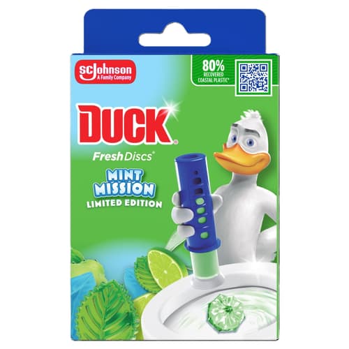 Élvezd a Duck Fresh Discs MintMatrix limitált kiadású frissességét minden öblítésnél! A mentás illat hosszan tartó tisztaságot biztosít a WC-csészében, egyszerű és higiénikus módon.