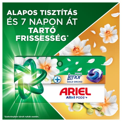 - MÉLYTISZTÍTÁS + HOSSZAN TARTÓ FRISSESSÉG: Az Ariel Allin1 PODS+ mosókapszula az alapos tisztítás mellett 7 napos frissességgel tölti fel a ruhákat (szekrényben tárolt ruhák esetén)