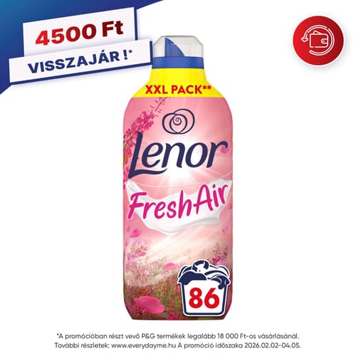 Élvezze a friss levegőn szárított ruhák illatának élményét még akkor is, ha otthonában teregeti ki őket! A Lenor Fresh Air extra frissességet nyújtó formulája koncentráltabb a többi Lenor textilöblítőnél, így a kisebb flakon is Xx mosáshoz elegendő. Innovatív technológiájának köszönhetően használatához csupán kis mennyiségre van szükség a friss levegő illatának élményéhez, függetlenül az időjárástól! A dohos szag elleni védelemmel kombinálva a Lenor Fresh Air Pink Blossom öblítő a hosszan tartó frissesség élményét nyújtja. Lélegezze be a friss, virágos illatot! Az édes és megnyugtató jegyek keveréke a dohos szagok elleni védelemmel kombinálva hosszan tartó frissességet kínál. Újrahasznosított műanyag flakon a kupak, az adagoló és a borítófólia kivételével. A friss levegőn szárított ruhák illatának élményéhez a Lenor Fresh Air textilöblítőt fogyasztók bevonásával fejlesztették ki, így a ruhákból folyamatosan szabadul fel a frissesség nemcsak közvetlenül a szárítás után, de a szekrényben tárolásuk vagy a viselésük során is.