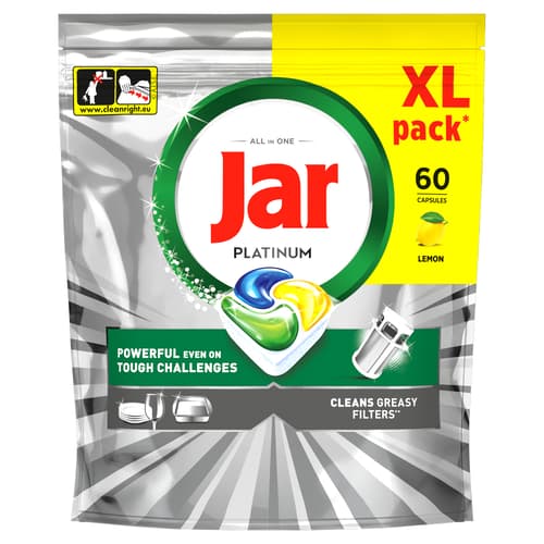 A Jar Platinum All in One mosogatókapszula segítségével még a makacs szennyeződésekkel is megbirkózhat a tisztább edények és a ragyogóbb mosogatógép érdekében (a Jar Original mosogatókapszulához képest). Hatékony még a makacs szennyeződések – például a rászáradt zsír vagy az odaégett étel – esetén is, és ragyogóan tisztává varázsolja az edényeket és a szűrőt. Éppoly hatékony, mint a Jar folyékony mosogatószer, csak egy kényelmes mosogatókapszula formájában. A Jar Platinum rendkívül jól oldódó bevonata gyorsan feloldódik, és a mosogatószer azonnal kifejti hatását a hatékony tisztítás érdekében. A mosogatókapszula a folyékony és a por állagú mosogatószerek erejét ötvözi magában, így páratlan tisztítóhatást és kényelmes használatot tesz lehetővé. Tapasztalja meg a makulátlan ragyogást és a tiszta, friss illatú mosogatógépet. A mosogatókapszulák használata rendkívül egyszerű – ráadásul vízlágyító sót és öblítőt is tartalmaznak. Helyezzen egy kapszulát az adagolóba, és azonnal zárja le a fedelét. Ne nyúljon hozzá nedves kézzel. A kapszulát ne bontsa ki és ne szúrja fel. Minden egyes használatot követően zárja le újra a tasakot.