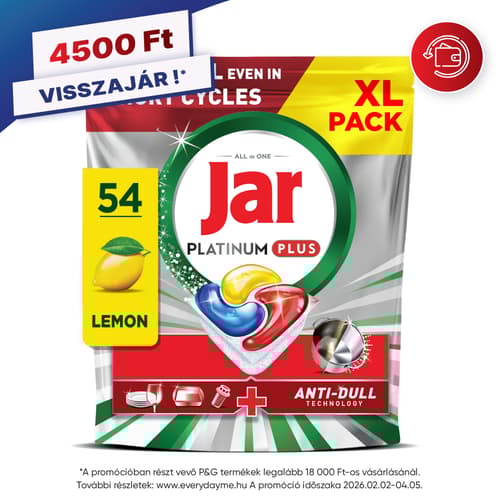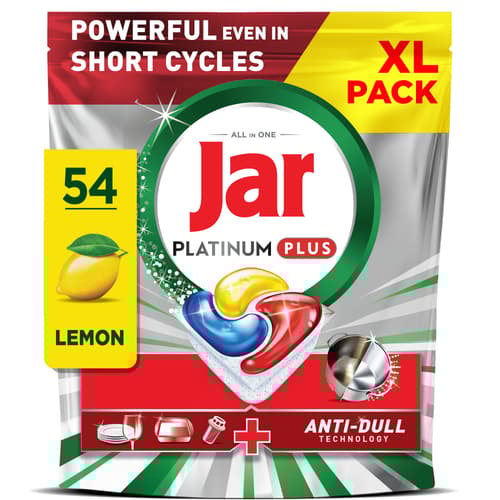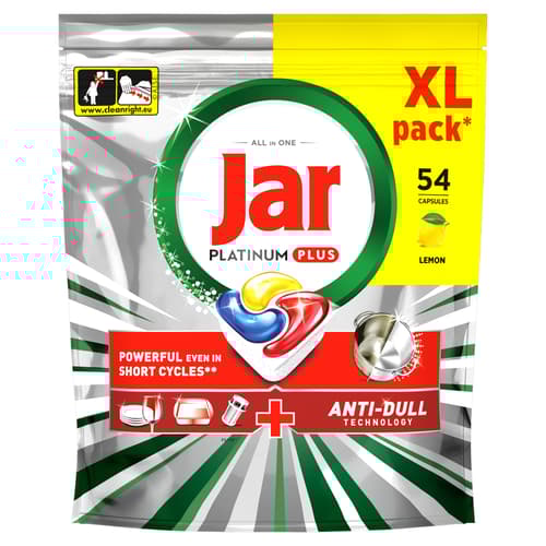 KIMAGASLÓ TISZTÍTÓERŐ MÉG RÖVID PROGRAMOK ESETÉN IS. Fedezze fel a Jar Platinum Plus All in One mosogatókapszulát, amely ideális megoldás, ha előmosogatás nélkül szeretne elérni makulátlanul tiszta edényeket. A Jar folyékony mosogatószerhez hasonlóan megbirkózik a makacs szennyeződésekkel, egy hatékony, a mosogatógéphez tervezett kapszula formájában A megfakulás elleni technológiának köszönhetően a Jar Platinum Plus megszünteti a fakóságot, és helyreállítja az edények eredeti ragyogását. A Jar Platinum Plus rendkívül jól oldódó kapszulája gyorsan feloldódik, és a hatékony tisztítás érdekében azonnal kifejti intenzív hatását. A mosogatókapszula a folyékony és a por állagú mosogatószerek erejét ötvözi magában, így páratlan tisztítóhatást és kényelmes használatot tesz lehetővé. Felveszi a küzdelmet a makacs, zsíros szennyeződésekkel szemben, még rövid programok esetén is (< 55 perces, előre beprogramozott mosogatási ciklus esetén is). Tapasztalja meg a ragyogó edényeket, a fakulás elleni technológiát és a mosogatógépet frissen tartó tiszta szűrőt. A mosogatókapszulák használata rendkívül egyszerű – ráadásul vízlágyító sót és öblítőt is tartalmaznak. Ne nyúljon hozzá nedves kézzel. Minden egyes használatot követően zárja le újra a tasakot.