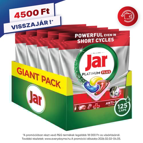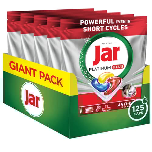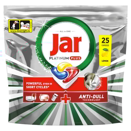 KIMAGASLÓ TISZTÍTÓERŐ MÉG RÖVID PROGRAMOK ESETÉN IS. Fedezze fel a Jar Platinum Plus All in One mosogatókapszulát, amely ideális megoldás, ha előmosogatás nélkül szeretne elérni makulátlanul tiszta edényeket. A Jar folyékony mosogatószerhez hasonlóan megbirkózik a makacs szennyeződésekkel, egy hatékony, a mosogatógéphez tervezett kapszula formájában A megfakulás elleni technológiának köszönhetően a Jar Platinum Plus megszünteti a fakóságot, és helyreállítja az edények eredeti ragyogását. A Jar Platinum Plus rendkívül jól oldódó kapszulája gyorsan feloldódik, és a hatékony tisztítás érdekében azonnal kifejti intenzív hatását. A mosogatókapszula a folyékony és a por állagú mosogatószerek erejét ötvözi magában, így páratlan tisztítóhatást és kényelmes használatot tesz lehetővé. Felveszi a küzdelmet a makacs, zsíros szennyeződésekkel szemben, még rövid programok esetén is (< 55 perces, előre beprogramozott mosogatási ciklus esetén is). Tapasztalja meg a ragyogó edényeket, a fakulás elleni technológiát és a mosogatógépet frissen tartó tiszta szűrőt. A mosogatókapszulák használata rendkívül egyszerű – ráadásul vízlágyító sót és öblítőt is tartalmaznak. Ne nyúljon hozzá nedves kézzel. Minden egyes használatot követően zárja le újra a tasakot.