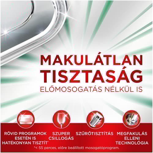MÉG RÖVID PROGRAMOK ESETÉN IS HATÉKONY: Az intenzív hatású mosogatókapszula a folyékony és a por állagú mosogatószerek erejét ötvözi magában, így már az 1. alkalommal hatékonyan tisztít még rövid programok esetén is (< 55 perc)