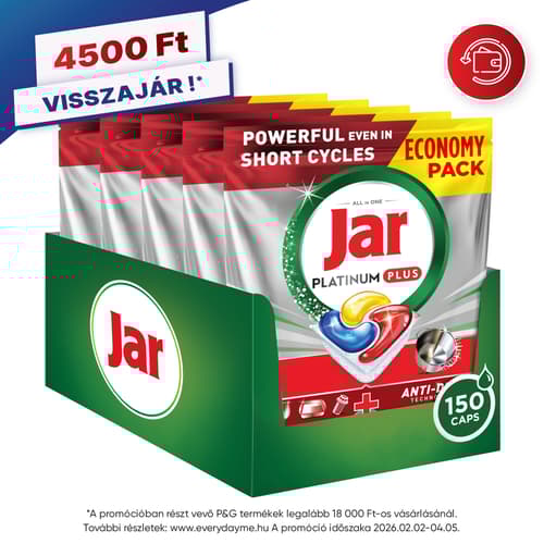 KIMAGASLÓ TISZTÍTÓERŐ MÉG RÖVID PROGRAMOK ESETÉN IS. Fedezze fel a Jar Platinum Plus All in One mosogatókapszulát, amely ideális megoldás, ha előmosogatás nélkül szeretne elérni makulátlanul tiszta edényeket. A Jar folyékony mosogatószerhez hasonlóan megbirkózik a makacs szennyeződésekkel, egy hatékony, a mosogatógéphez tervezett kapszula formájában A megfakulás elleni technológiának köszönhetően a Jar Platinum Plus megszünteti a fakóságot, és helyreállítja az edények eredeti ragyogását. A Jar Platinum Plus rendkívül jól oldódó kapszulája gyorsan feloldódik, és a hatékony tisztítás érdekében azonnal kifejti intenzív hatását. A mosogatókapszula a folyékony és a por állagú mosogatószerek erejét ötvözi magában, így páratlan tisztítóhatást és kényelmes használatot tesz lehetővé. Felveszi a küzdelmet a makacs, zsíros szennyeződésekkel szemben, még rövid programok esetén is (< 55 perces, előre beprogramozott mosogatási ciklus esetén is). Tapasztalja meg a ragyogó edényeket, a fakulás elleni technológiát és a mosogatógépet frissen tartó tiszta szűrőt. A mosogatókapszulák használata rendkívül egyszerű – ráadásul vízlágyító sót és öblítőt is tartalmaznak. Ne nyúljon hozzá nedves kézzel. Minden egyes használatot követően zárja le újra a tasakot.