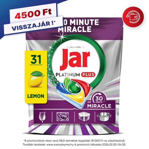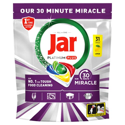 JAR 30 MINUTE MIRACLE TISZTÍTÓERŐ: Makulátlan tisztaságú edények még a legrövidebb programmal is: Jar Our 30 Minute Miracle Platinum Plus mosogatókapszula. Már az 1. alkalommal hatékonyan tisztít és kellemes citromillatot hagy maga után