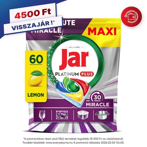 ALL IN ONE VARÁZSLAT A RAGYOGÓ EDÉNYEKÉRT, KÖNNYEDÉN. Jar Our 30 Minute Miracle Platinum Plus – az 1. számú megoldásunk a makacs ételmaradványokkal szemben. Ezek az all in one mosogatókapszulák makulátlan végeredményt nyújtanak még a legrövidebb programok esetén is, kellemes citromillatot hagyva maguk után. Az intenzív hatású, ötrekeszes kapszula ragyogóan tiszta és csillogó edényeket hagy maga után, gyors száradást eredményez, a zsíros szűrőt is tisztítja, valamint megfakulás elleni technológiával rendelkezik. A Jar Original All-in-One termékhez képest 3x több zsíroldó összetevővel mindössze 30 perc alatt eltávolítja a legmakacsabb ételmaradványokat is. A Jar már az 1. alkalommal hatékonyan tisztít hosszú és rövid programokon egyaránt, így sem elő-, sem újramosogatásra nincs szükség. Éppoly hatékony, mint a Jar folyékony mosogatószer, csak egy kényelmes mosogatókapszula formájában. A Jar mosogatókapszulával nincs szükség külön vízlágyító sóra vagy öblítőszerre. Mivel gyorsan és makulátlanul tisztít, ezért tökéletes megoldás a gyakran mosogató háztartások számára, az éjszakai áztatás hatékonyságával. Tapasztalja meg a Miracle erejét és élvezze a ragyogó végeredményt a Jar 5 rekeszes tisztítóerejének köszönhetően.