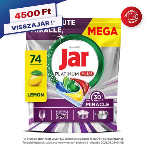 ALL IN ONE VARÁZSLAT A RAGYOGÓ EDÉNYEKÉRT, KÖNNYEDÉN. Jar Our 30 Minute Miracle Platinum Plus – az 1. számú megoldásunk a makacs ételmaradványokkal szemben. Ezek az all in one mosogatókapszulák makulátlan végeredményt nyújtanak még a legrövidebb programok esetén is, kellemes citromillatot hagyva maguk után. Az intenzív hatású, ötrekeszes kapszula ragyogóan tiszta és csillogó edényeket hagy maga után, gyors száradást eredményez, a zsíros szűrőt is tisztítja, valamint megfakulás elleni technológiával rendelkezik. A Jar Original All-in-One termékhez képest 3x több zsíroldó összetevővel mindössze 30 perc alatt eltávolítja a legmakacsabb ételmaradványokat is. A Jar már az 1. alkalommal hatékonyan tisztít hosszú és rövid programokon egyaránt, így sem elő-, sem újramosogatásra nincs szükség. Éppoly hatékony, mint a Jar folyékony mosogatószer, csak egy kényelmes mosogatókapszula formájában. A Jar mosogatókapszulával nincs szükség külön vízlágyító sóra vagy öblítőszerre. Mivel gyorsan és makulátlanul tisztít, ezért tökéletes megoldás a gyakran mosogató háztartások számára, az éjszakai áztatás hatékonyságával. Tapasztalja meg a Miracle erejét és élvezze a ragyogó végeredményt a Jar 5 rekeszes tisztítóerejének köszönhetően.