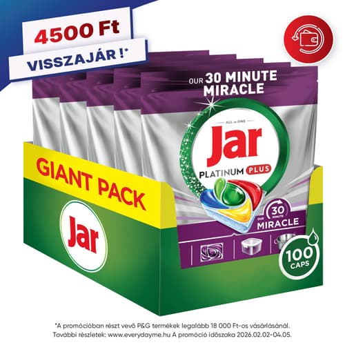 ALL IN ONE VARÁZSLAT A RAGYOGÓ EDÉNYEKÉRT, KÖNNYEDÉN. Jar Our 30 Minute Miracle Platinum Plus – az 1. számú megoldásunk a makacs ételmaradványokkal szemben. Ezek az all in one mosogatókapszulák makulátlan végeredményt nyújtanak még a legrövidebb programok esetén is, kellemes citromillatot hagyva maguk után. Az intenzív hatású, ötrekeszes kapszula ragyogóan tiszta és csillogó edényeket hagy maga után, gyors száradást eredményez, a zsíros szűrőt is tisztítja, valamint megfakulás elleni technológiával rendelkezik. A Jar Original All-in-One termékhez képest 3x több zsíroldó összetevővel mindössze 30 perc alatt eltávolítja a legmakacsabb ételmaradványokat is. A Jar már az 1. alkalommal hatékonyan tisztít hosszú és rövid programokon egyaránt, így sem elő-, sem újramosogatásra nincs szükség. Éppoly hatékony, mint a Jar folyékony mosogatószer, csak egy kényelmes mosogatókapszula formájában. A Jar mosogatókapszulával nincs szükség külön vízlágyító sóra vagy öblítőszerre. Mivel gyorsan és makulátlanul tisztít, ezért tökéletes megoldás a gyakran mosogató háztartások számára, az éjszakai áztatás hatékonyságával. Tapasztalja meg a Miracle erejét és élvezze a ragyogó végeredményt a Jar 5 rekeszes tisztítóerejének köszönhetően.