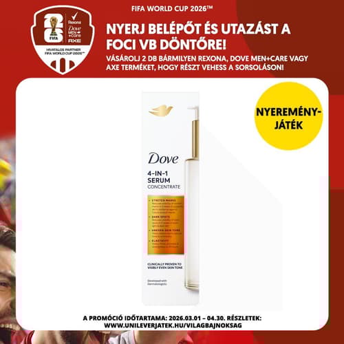 A Dove 4 az 1-ben testszérum segít csökkenteni a sötét foltok és striák láthatóságát, miközben feszesíti és erősíti a bőrt. Könnyű, gyorsan felszívódó formula.